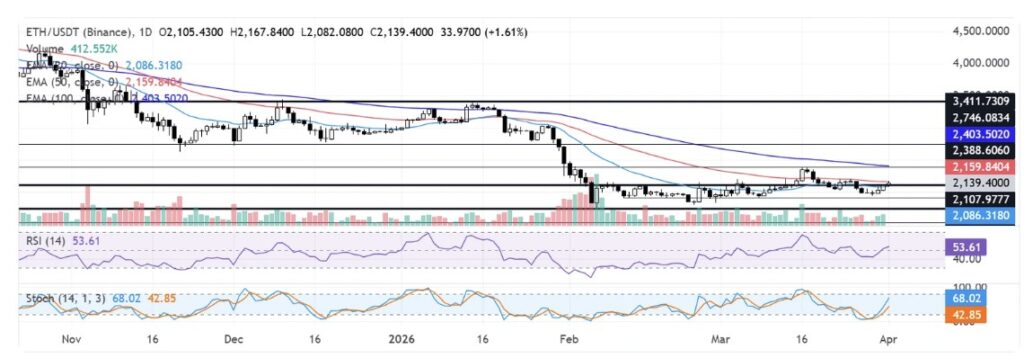 Ethereum recorded liquidations of $57.4 million on April 1, with short positions dominating at $41.16 million, based on Coinglass data. On the daily chart, ETH is trading at $2,130. In the short term, the bias is still moderately bullish as the price remains above the 20-day Exponential Moving Average (EMA) around $2,085, while showing stabilization after the latest correction.