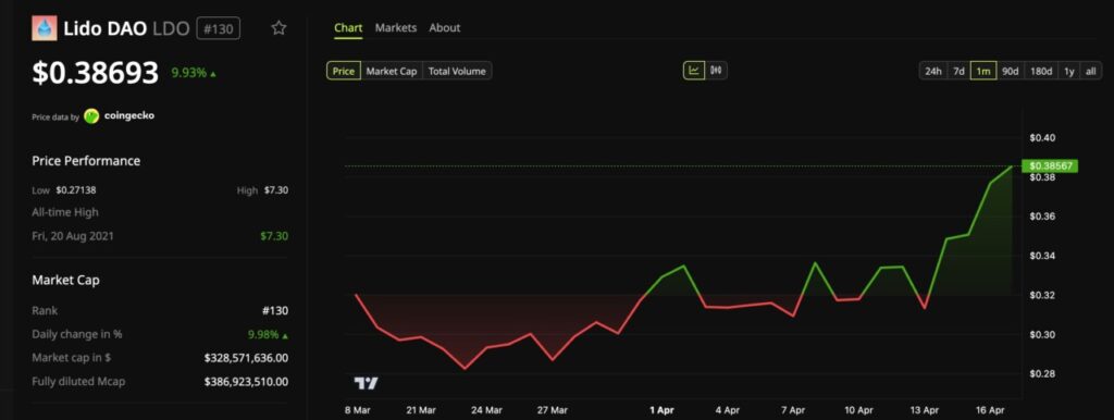 Jakarta, Pintu News – Jakarta, Pintu News – In the midst of general cryptocurrency market weakness, Lido DAO LDO) has performed admirably by recording the highest price in the last 10 weeks. The staking platform’s governance token broke through the intraday level of $0.39, representing a gain of more than 23% in just seven days. This anomalous movement attracted great attention as LDO was able to provide significant profits for you at a time when the total market capitalization of other cryptos was actually experiencing a slight decline.