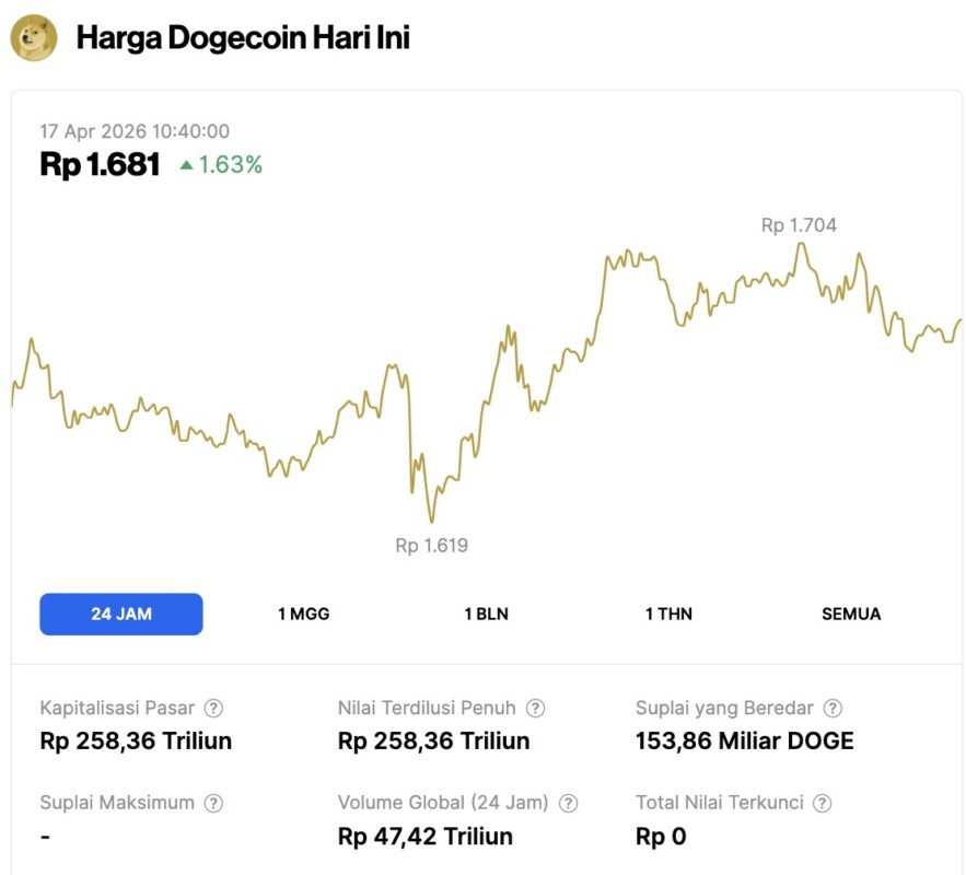 Dogecoin demonstrated renewed strength on April 17, 2026, posting a 1.63% gain over the past 24 hours to trade at $0.09789 (approximately IDR 1,681). Throughout the daily trading session, the meme coin navigated a steady channel, bouncing from a local low of IDR 1,619 before touching an intraday high of IDR 1,704.