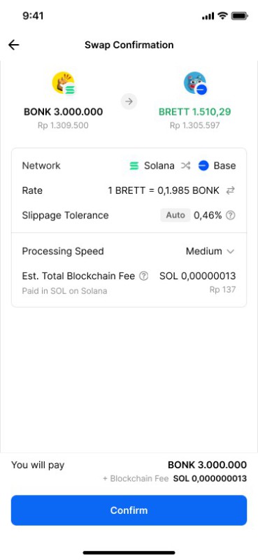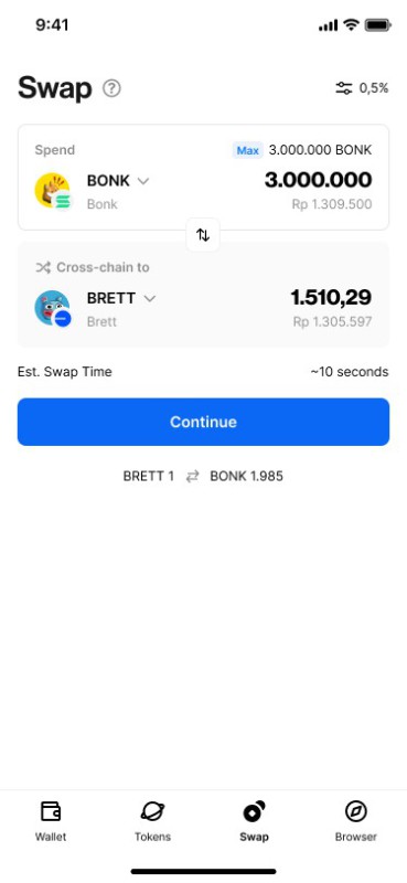 For example, if you want to swap BONK (on the Solana network) for Brett (on the Base network), here’s a simple step-by-step guide: