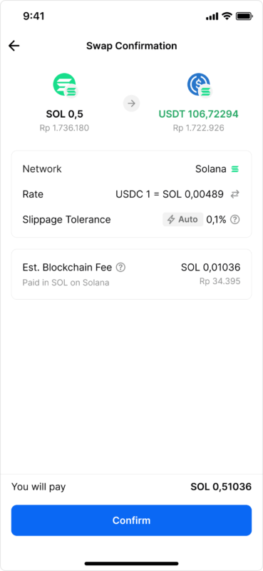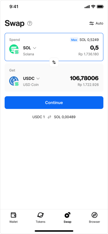 For example, if you want to swap SOL for USDC, enter SOL in the top field and USDC in the bottom field. Then, enter the amount you wish to swap or tap ‘Max’ to exchange your entire balance, and tap ‘Continue’