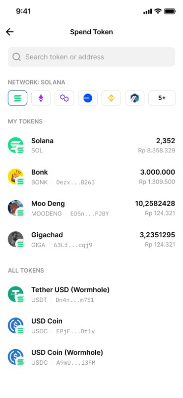 After tapping ‘Spend’, choose the source network by clicking on its logo. Pintu Web3 supports several networks including Solana, Ethereum, Polygon, Base, Binance Smart Chain, Arbitrum, and more