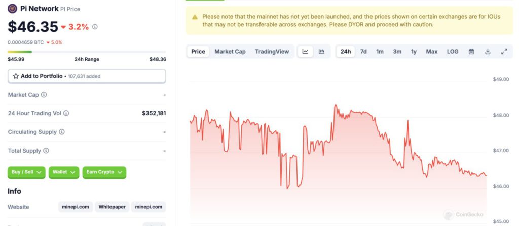 Dalam 24 jam terakhir, harga Pi bergerak dalam rentang antara $45.99 hingga $48.36, dengan volume perdagangan mencapai $352.181. Grafik harga menunjukkan fluktuasi moderat, dengan beberapa lonjakan dan penurunan dalam periode tersebut.