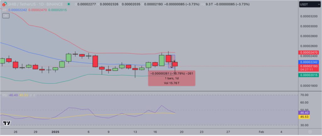 Jakarta, Pintu News ā Harga Shiba Inu mengalami penurunan 5% menjadi $0.000022 (Rp0,36) pada 19 Januari, akibat tekanan jual yang meningkat. Penurunan ini terjadi setelah peluncuran token $TRUMP, yang melonjak 131% dalam 24 jam pertama dan mencapai valuasi $12,5 miliar (Rp204,5 triliun).