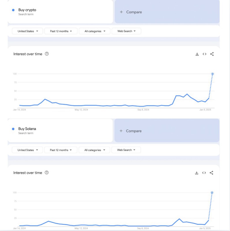 Jakarta, Pintu News – Peluncuran memecoin “Official Trump” yang berbasis Solana oleh Presiden terpilih Donald Trump telah memicu euforia di dunia cryptocurrency. Data Google Trends menunjukkan lonjakan besar dalam pencarian “buy crypto” dan “buy Solana,” keduanya mencapai skor pencarian tertinggi, yaitu 100. Istilah terkait seperti “Coinbase” dan “crypto app” juga mengalami peningkatan yang signifikan.