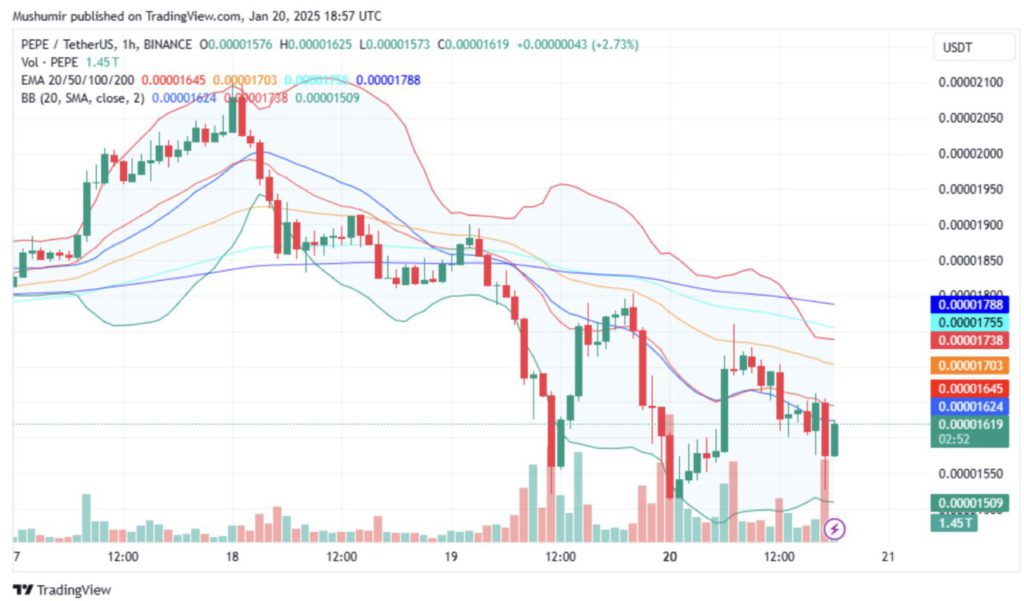 Dilansir dari Blockchain Reporter (20/1/25), harga Pepe Coin (PEPE) menunjukkan fluktuasi yang signifikan, meskipun saat ini sedang mengalami kenaikan sebesar 2,73%. Grafik menunjukkan pergerakan harga dalam kerangka waktu satu jam di platform Binance, dengan harga PEPE diperdagangkan di sekitar 0.00001619 USDT.