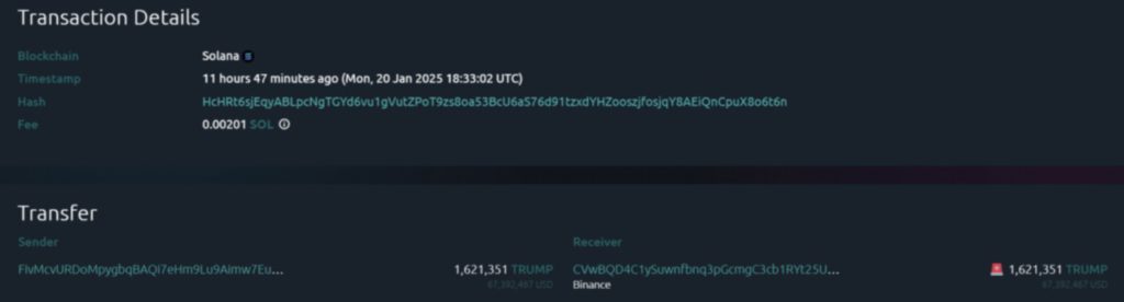 Dua transaksi besar terkait token meme TRUMP baru-baru ini terungkap, menunjukkan aktivitas penjualan atau transfer token. Transaksi tersebut bernilai total Rp1,21 triliun (setara $74,22 juta) dan terjadi tepat setelah pelantikan Presiden AS, di mana Donald Trump resmi dilantik untuk masa jabatan keduanya.