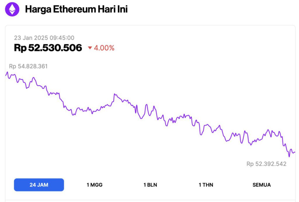 Jakarta, Pintu News – Harga Ethereum hari ini, 23 Januari 2025, merosot menyentuh level Rp52 juta, mencatat penurunan di tengah tekanan pasar yang terus berlangsung. Meski demikian, sejumlah indikator menunjukkan potensi pemulihan harga dalam waktu dekat.