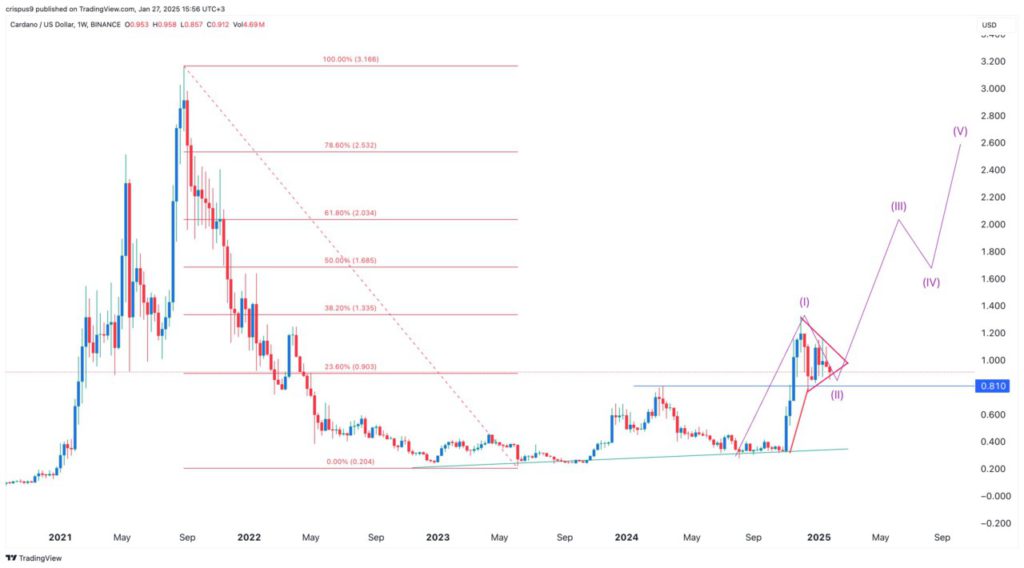 Meskipun harga Cardano sedang mengalami penurunan, tren bullish jangka panjang masih terlihat. Grafik mingguan menunjukkan pembentukan pola pennant bullish, dengan konsolidasi saat ini menjadi bagian dari pola tersebut.