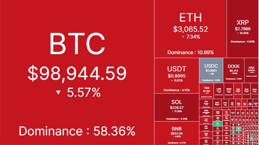 Crash pasar saham juga memengaruhi pasar cryptocurrency, yang sering kali mencerminkan dinamika pasar keuangan tradisional. Kapitalisasi pasar kripto global turun 7% dalam sehari, dengan Bitcoin kehilangan 5% nilainya, mencapai harga $98.900 (sekitar Rp1,6 miliar).