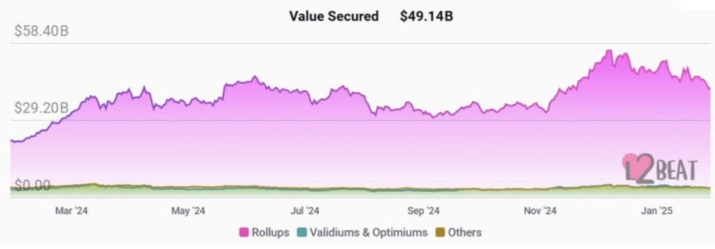 Salah satu kekhawatiran utama bagi investor bullish Ethereum adalah total nilai terkunci (Total Value Locked/TVL) di solusi layer-2 Ethereum, yang turun 25% setelah mencapai rekor tertinggi $65,3 miliar (sekitar Rp1.061 triliun) pada 8 Desember 2024.