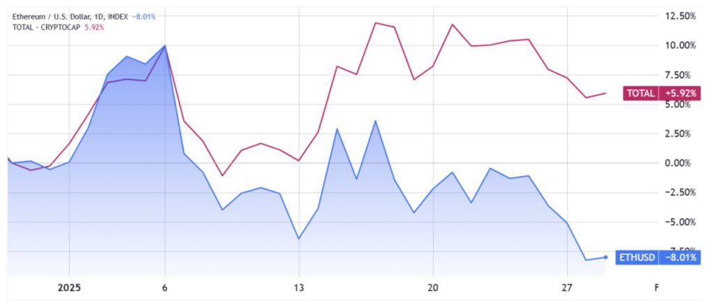 Namun, harga Ethereum sendiri memang sudah menunjukkan kinerja yang kurang optimal, dengan kenaikan hanya 26,8% pada kuartal keempat 2024, sementara kapitalisasi pasar crypto secara keseluruhan tumbuh sebesar 44,6%.