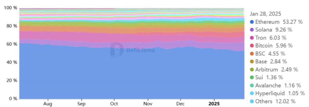 Solana kini menjadi blockchain terdepan dalam volume perdagangan di bursa terdesentralisasi (DEX), sementara Tron berhasil menguasai 28% pangsa pasar stablecoin.
