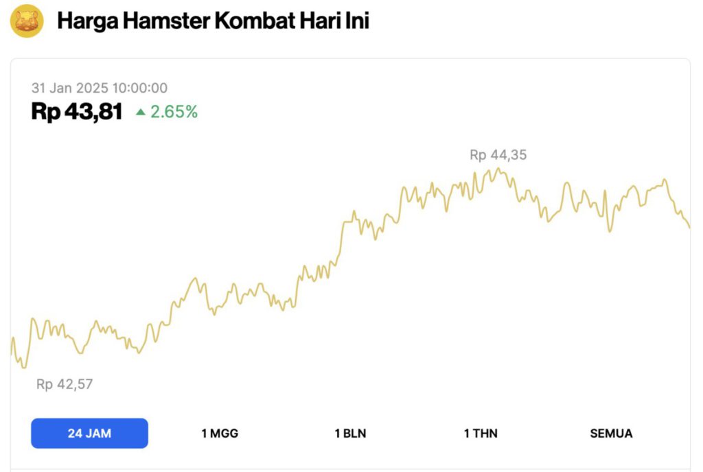 Sejalan dengan ketiga memecoin tersebut, harga Hamster Kombat (HMSTR) juga tercatat mengalami kenaikan 2,65% dalam periode waktu yang sama. HMSTR sempat menyentuh harga terendahnya di Rp42,57 dan harga tertingginya di Rp44,35.