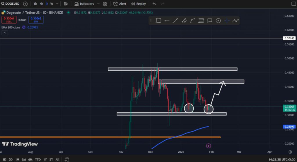 Analisis teknikal menunjukkan bahwa DOGE sedang membentuk pola double bottom bullish pada grafik harian. Saat ini, harga DOGE telah mencapai titik bottom kedua, yang sering kali menandakan pembalikan tren ke arah kenaikan.
