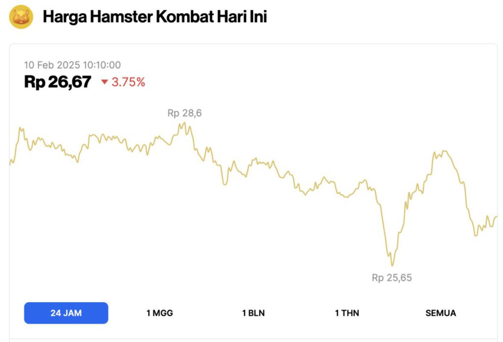 Sejalan dengan ketiga memecoin tersebut, harga Hamster Kombat (HMSTR) juga tercatat mengalami koreksi 3,75% dalam periode waktu yang sama. HMSTR sempat menyentuh harga terendahnya di Rp25,65 dan harga tertingginya di Rp28,6.