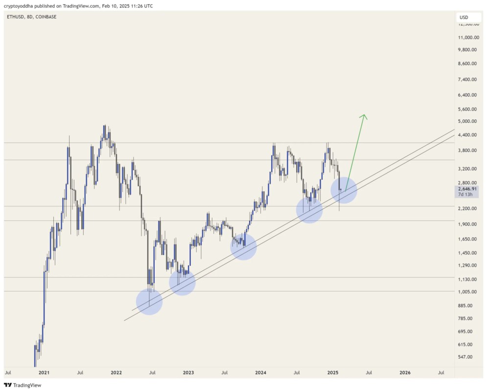Pada hari Senin, Raja Altcoin berhasil merebut kembali dukungan yang hilang, dengan perdagangan di atas tanda $2.650 sepanjang pagi. Beberapa pengamat pasar mencatat bahwa ETH tetap berada dalam dukungan “bounce or die” multi-tahun. Ethereum telah dalam dukungan tren naik sejak 2022, menguji ulang garis tren ini empat kali sebelumnya.