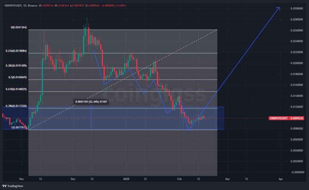 Berdasarkan analisis terbaru, harga PEPE telah bergerak di sekitar level Fibonacci penting. Saat artikel ini ditulis, harga PEPE berada di sekitar level 0.786 pada $0.0117220 (sekitar Rp189,7), yang merupakan zona support yang kuat dengan aktivitas perdagangan yang signifikan. Menurut data dari Coinglass, jika harga dapat bertahan di atas level ini, potensi rebound bisa terwujud. Namun, jika harga gagal mempertahankan level support ini dan turun lebih rendah, harga bisa jatuh menuju level 0.382 di harga $0.0191309 (sekitar Rp308,8).