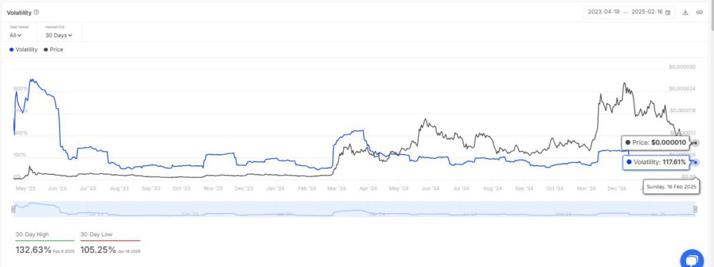 Volatilitas PEPE tetap cukup tinggi, dengan tingkat volatilitas mencapai 117.61% pada 16 Februari. Angka ini mengikuti level tertinggi 132.63% pada 8 Februari dan level terendah 105.25% pada 18 Januari. Menurut IntoTheBlock, volatilitas yang tinggi menunjukkan lingkungan harga yang dinamis, di mana pergerakan tajam bisa terjadi ke arah manapun.