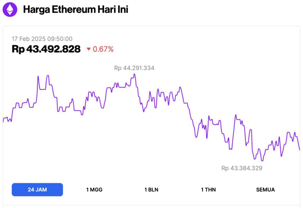 Pada 17 Februari 2025,Ā harga EthereumĀ (ETH) tercatat mengalami koreksi 0,67% dalam waktu 24 jam terakhir, diperdagangkan pada harga $2.668 atau sekitar Rp43.492.828. Grafik harga pada laman Pintu Market menunjukkan bahwa harga ETH sempat mencapai level tertingginya di Rp44.291.334, dan level terendahnya di Rp43.384.329.