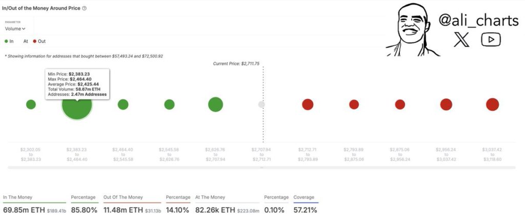 Harga Ethereum saat ini menunjukkan stabilitas yang cukup baik setelah bertahan di zona harga $2.380 hingga $2.460, yang dianggap sebagai area akumulasi penting. Di zona ini, sekitar 2,47 juta alamat telah membeli sekitar 5,87 juta ETH, menunjukkan adanya dukungan yang kuat dari pemegang ETH. Data ini menunjukkan bahwa sebagian besar posisi investor kini berada dalam keadaan menguntungkan, dengan sekitar 85,8% posisi dalam kondisi āin the moneyā, yang berarti investor tidak menghadapi tekanan jual yang signifikan.