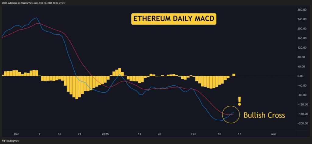 Salah satu indikator teknikal yang memberikan sinyal positif bagi Ethereum adalah crossover bullish pada grafik MACD (Moving Average Convergence Divergence) harian. Crossover ini menunjukkan potensi pembalikan tren dari penurunan yang terjadi sejak Desember lalu. Dalam analisis MACD, pergerakan histogram yang masuk ke wilayah positif semakin memperkuat kemungkinan terjadinya tren naik.