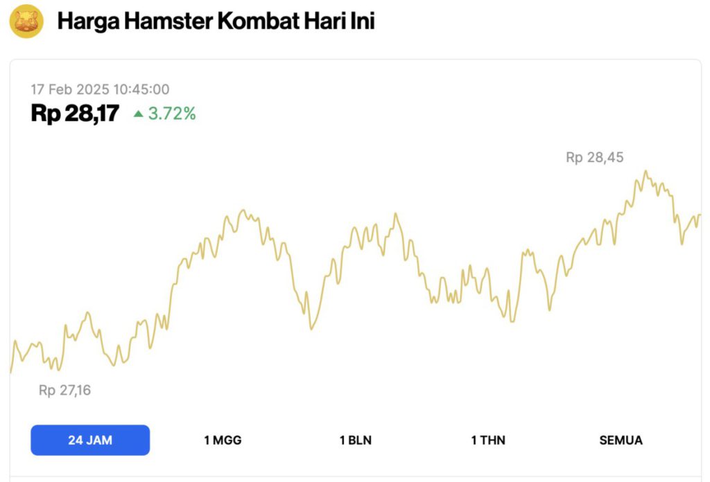 Berbeda dengan ketiga memecoin tersebut, harga Hamster Kombat (HMSTR) mengalami kenaikan 3,72% dalam periode waktu yang sama. HMSTR sempat menyentuh harga terendahnya di Rp27,16 dan harga tertingginya di Rp28,45.