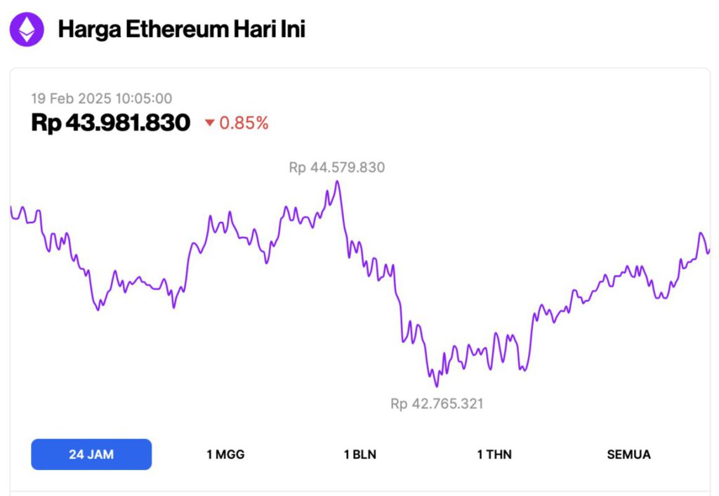 Pada 19 Februari 2025, harga Ethereum (ETH) tercatat mengalami penurunan 0,85% dalam waktu 24 jam terakhir, diperdagangkan pada harga $2.686 atau sekitar Rp43.981.830. Grafik harga pada laman Pintu Market menunjukkan bahwa harga ETH sempat mencapai level tertingginya di Rp44.579.830, dan level terendahnya di Rp42.765.321.