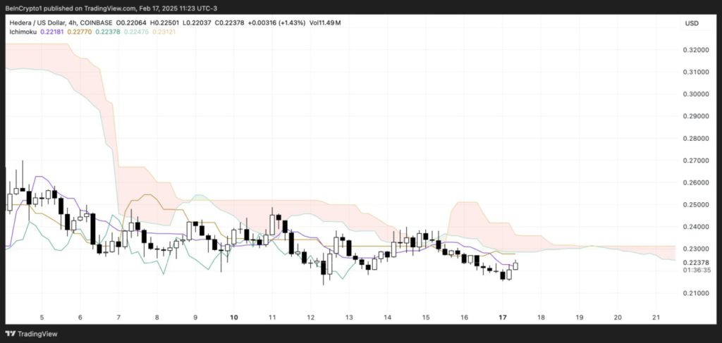 Awan Ichimoku untuk HBAR menunjukkan harga saat ini diperdagangkan di bawah awan, menandakan tren bearish. Garis dasar (Kijun-sen) dan garis konversi (Tenkan-sen) keduanya datar, menunjukkan momentum yang lemah. Untuk pembalikan tren, harga perlu menembus di atas awan, yang saat ini berada di sekitar $0,23.