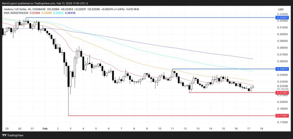 Grafik harga Hedera menunjukkan garis EMA jangka pendeknya diperdagangkan di bawah yang jangka panjang, mengonfirmasi tren bearish. Jika tren penurunan berlanjut, HBAR bisa menguji level dukungan $0,21, dan kehilangan itu bisa mendorongnya lebih jauh ke bawah hingga $0,179.
