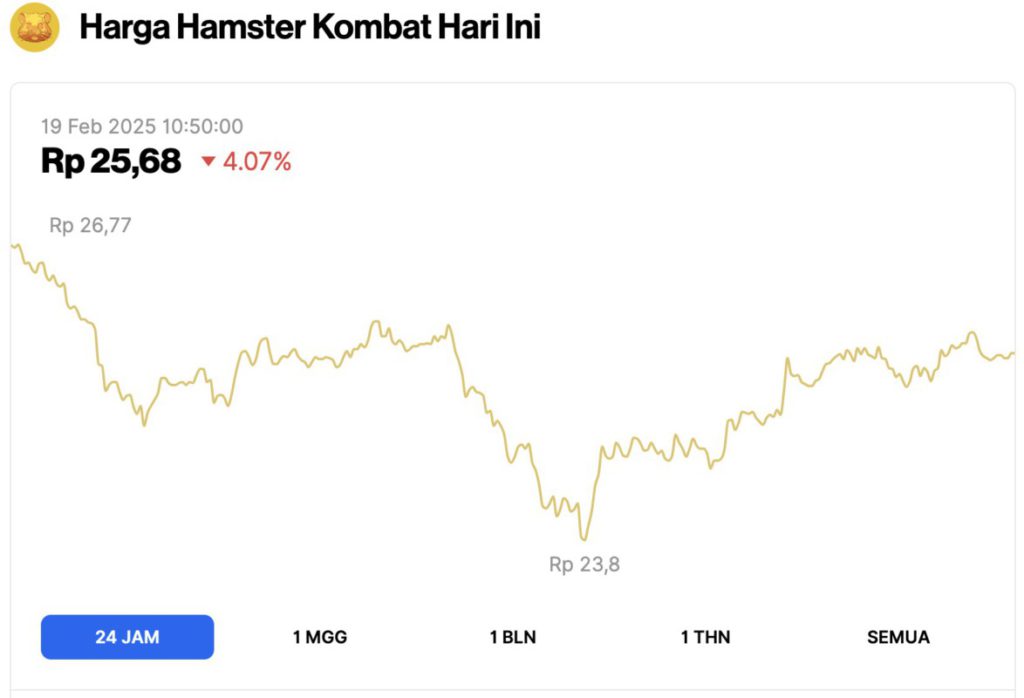 Sejalan dengan ketiga memecoin tersebut, harga Hamster Kombat (HMSTR) juga mengalami koreksi sebesar 4,07% dalam periode waktu yang sama. HMSTR sempat menyentuh harga terendahnya di Rp23,8 dan harga tertingginya di Rp26,77.