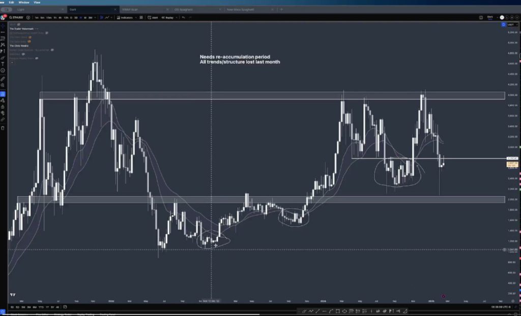 DocXBT, pengamat pasar, berpendapat bahwa Ethereum (ETH) memerlukan periode re-akumulasi yang panjang untuk mencoba merebut kembali level yang lebih tinggi. Analis tersebut menyatakan bahwa Ethereum (ETH) mungkin akan bergerak datar dalam jangka waktu dua hingga tiga bulan sebelum tren dapat diubah dan mungkin menjadi bullish lagi. Ini mirip dengan periode re-akumulasi yang terjadi selama kejatuhan FTX, kapitulasi tahun 2023, dan kapitulasi musim panas tahun 2024.