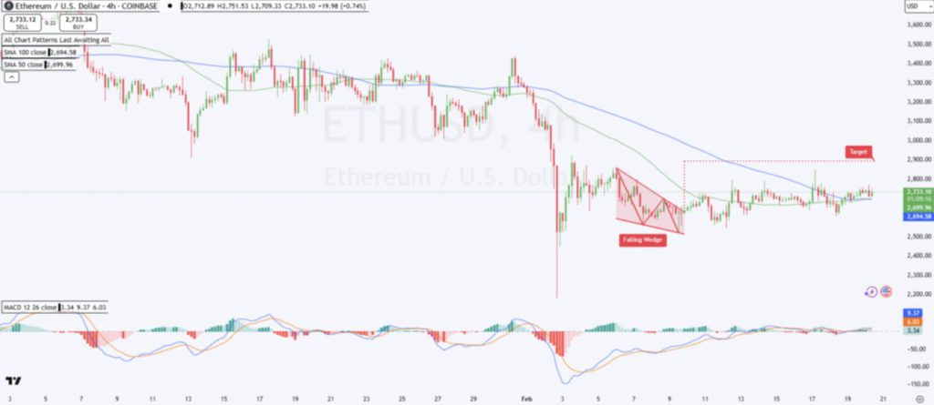 Histogram pada MACD juga berubah menjadi hijau, semakin mengonfirmasi tekanan naik yang semakin kuat. Jika Ethereum berhasil menembus pola falling wedge yang terlihat pada grafiknya, harga bisa mendekati area resistance $2.800. Jika resistance ini berhasil dilampaui, Ethereum dapat melanjutkan trajektori kenaikannya menuju $4.000 (Rp65.168.000).