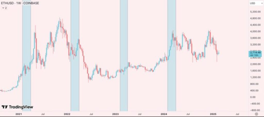 Dilansir dari Coingape, harga Ethereum menunjukkan kecenderungan untuk tampil kuat pada paruh kedua Kuartal 1 dalam beberapa tahun terakhir. Seorang trader swing bernama Honey mencatat bahwa secara historis, Ethereum mengalami pergerakan naik pada paruh kedua kuartal pertama.