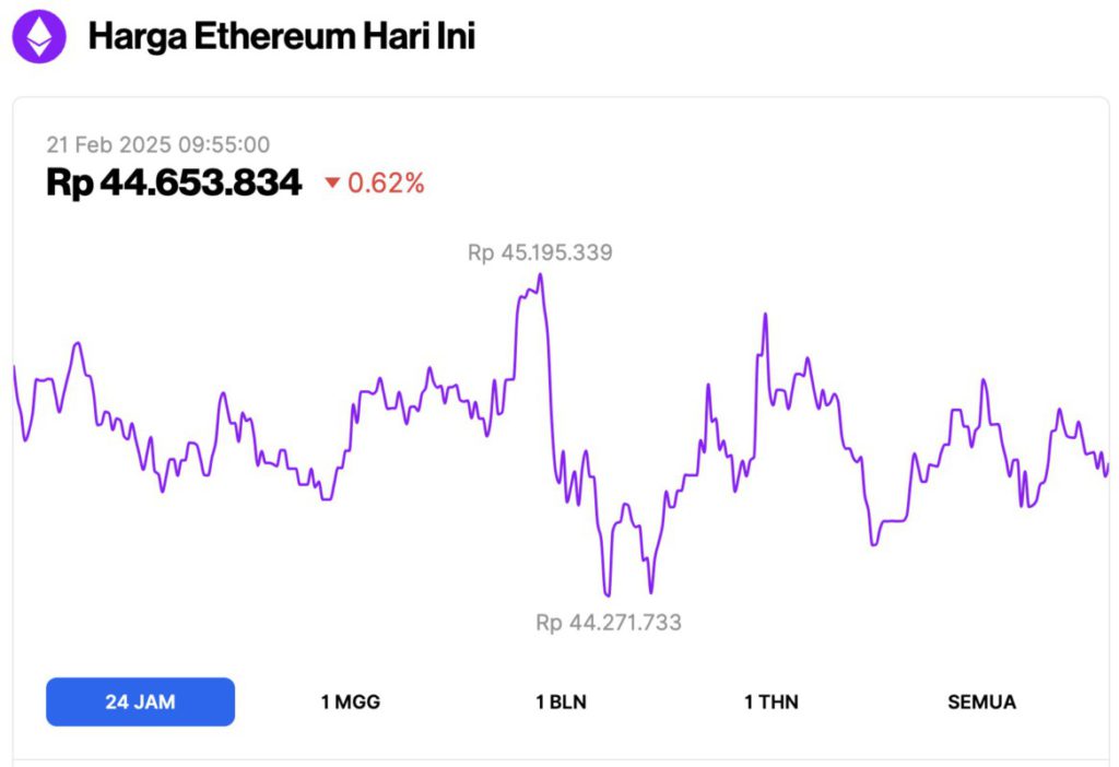 Pada 21 Februari 2025,Ā harga EthereumĀ (ETH) tercatat mengalami koreksi tipis 0,62% dalam waktu 24 jam terakhir, diperdagangkan pada harga $2.738 atau sekitar Rp44.653.834. Grafik harga pada laman Pintu Market menunjukkan bahwa harga ETH sempat mencapai level tertingginya di Rp45.195.339, dan level terendahnya di Rp44.271.733.