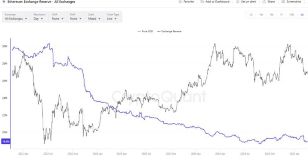 Cadangan Ethereum di bursa terpusat saat ini berada pada level terendah dalam hampir sembilan tahun. Pada 19 Februari 2025, cadangan Ethereum di seluruh bursa turun menjadi 18,95 juta, level terendah sejak 2016. Penurunan pasokan ini dapat mengindikasikan pengetatan Ether yang tersedia, yang berpotensi mendorong harga naik.