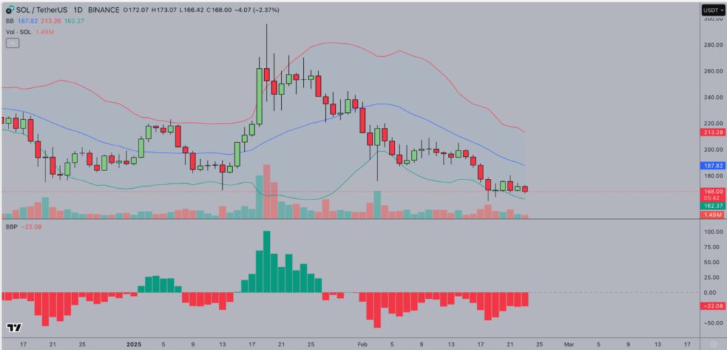 Berdasarkan analisis grafik harga terkini, Solana (SOL) menunjukkan sinyal bearish dengan perdagangan terakhir di $168,08 setelah penurunan mingguan sebesar 4%. Grafik harian menunjukkan bahwa aksi harga terkendala di bawah garis tengah Bollinger Bands yang berada di $185,89, menandakan adanya tekanan jual yang berkelanjutan.