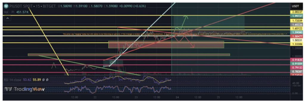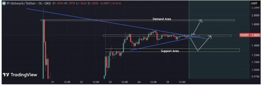 Pi Network (PI) saat ini sedang menguji pola konsolidasi dalam bentuk segitiga, dengan dukungan utama di $1,46 dan resistansi di sekitar $1,79.