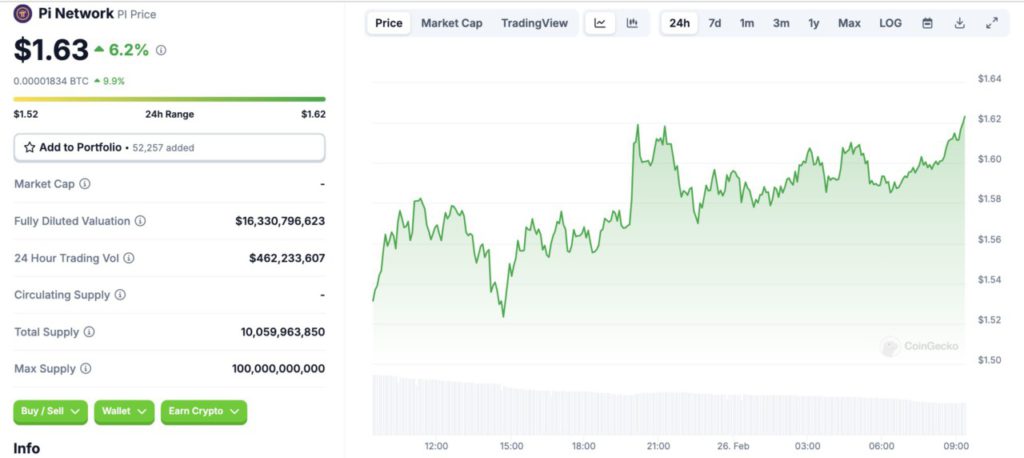 Pada 26 Februari 2025, harga Pi Network mengalami kenaikan signifikan dalam 24 jam terakhir, dengan harga saat ini berada di $1,63, naik sekitar 6,2%. Kenaikan ini menunjukkan sentimen bullish yang kuat di pasar, setelah beberapa hari sebelumnya stabil di sekitar harga $1,52 hingga $1,62.