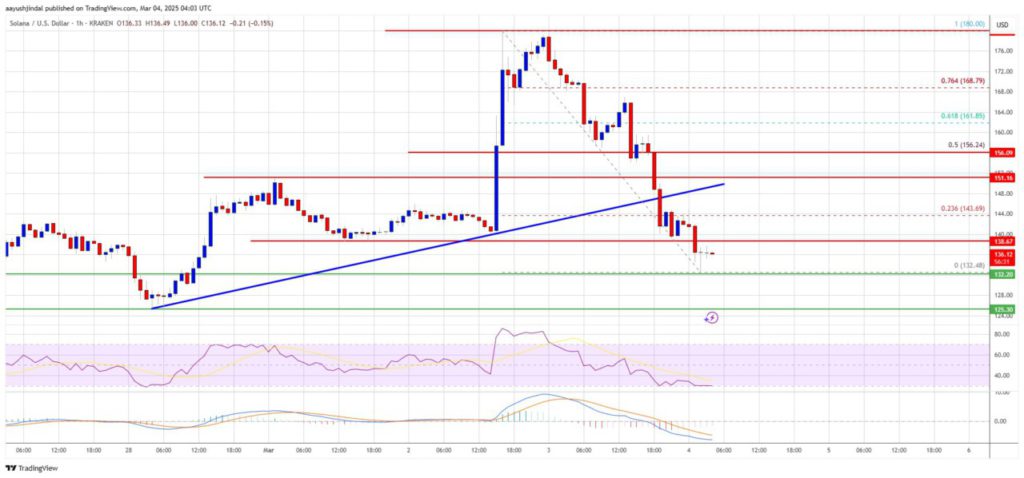 Penurunan ini semakin tajam setelah harga SOL menembus garis tren bullish pada level $148 (Rp2.440.372) di grafik per jam. Saat ini, SOL diperdagangkan di bawah $140 (Rp2.308.460) dan rata-rata pergerakan sederhana 100 jam. Jika tidak ada pemulihan signifikan, tekanan jual dapat terus berlanjut dalam waktu dekat.