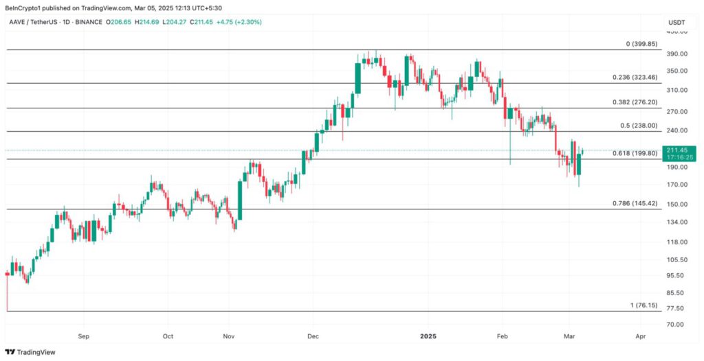 Saat ini, AAVE diperdagangkan pada harga $211,45, yang sedikit di atas level support $199,80. Jika tekanan jual terus berlanjut, kemungkinan besar level support ini akan sulit dipertahankan. Jika level ini berhasil ditembus, harga AAVE bisa turun hingga mencapai $145,42, level terendah yang terakhir kali dicapai pada November 2024.
