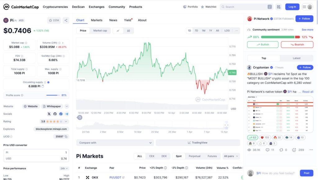 Volume perdagangan PI dalam 24 jam terakhir tercatat sebesar $339,95 juta, meski turun hampir 49% dibandingkan hari sebelumnya. Sementara itu, market cap PI mencapai $5,08 miliar, dengan circulating supply sebesar 6,86 miliar PI dari total suplai maksimal 100 miliar PI.
