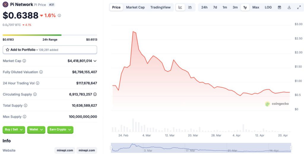 Dalam periode 24 jam in, harga PI bergerak dalam rentang $0.6183 hingga $0.6513, menunjukkan volatilitas yang cukup terbatas di tengah dinamika pasar kripto yang lebih luas.