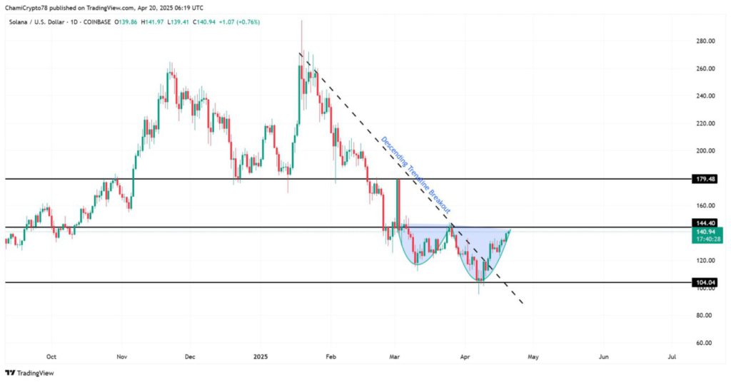 Solana (SOL) baru-baru ini berhasil menembus garis tren menurun yang telah membentuk dasar dari pola cangkir dan gagang yang klasik. Saat ini, pola tersebut mendekati resistensi lehernya di $144,40. Jika berhasil dilewati, ini bisa memicu kelanjutan momentum naik. Saat ini, harga berada di sekitar $139, yang menempatkan para bull dekat dengan pemicu breakout kunci.