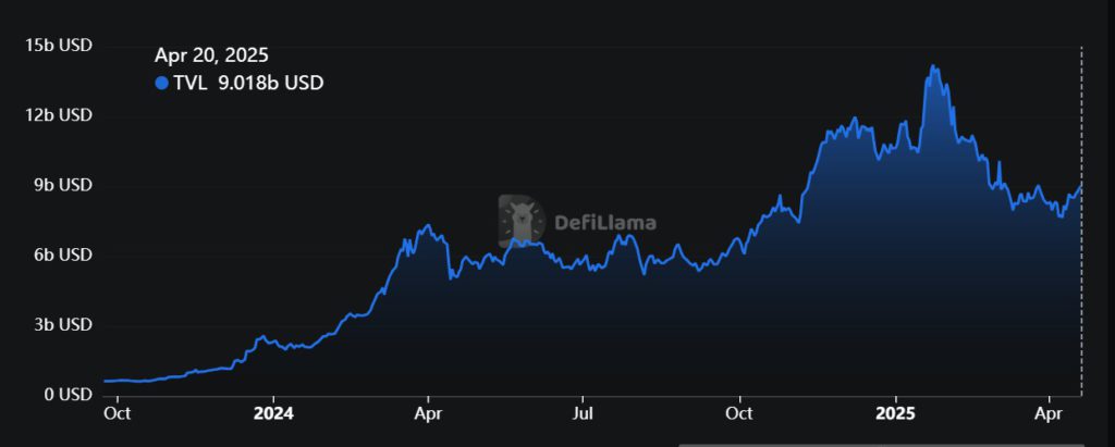 Aktivitas DeFi di jaringan Solana juga mendukung kasus bullish. Total Value Locked (TVL) di jaringan ini meningkat sebesar 3,11% dalam 24 jam, mendorong nilai di atas $9,018 miliar. Peningkatan aktivitas protokol ini menunjukkan bahwa Solana (SOL) mulai mendapatkan relevansi pasar kembali, terutama di antara penyedia likuiditas dan pengguna aplikasi terdesentralisasi.