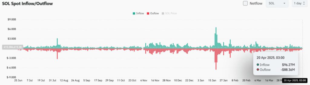 Namun, ketidakpercayaan ini sering kali menjadi awal dari sebuah short squeeze ketika dipadukan dengan akumulasi spot yang kuat. Selain itu, arus spot menunjukkan gambaran yang lebih konstruktif. Pada tanggal 20 April, total inflow mencapai $96,27 juta, sedikit lebih tinggi dari outflow yang berjumlah $88,36 juta. Meskipun perbedaannya terlihat kecil, inflow yang konsisten menunjukkan akumulasi yang persisten oleh para pelaku pasar, yang menambah bobot pada tesis bullish untuk Solana (SOL).