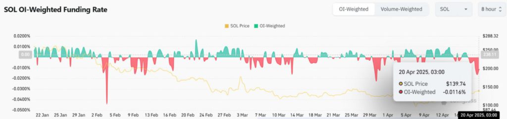 Meskipun aksi harga dan perilaku whale menunjukkan hal yang positif, data dari pasar derivatif menunjukkan cerita yang berbeda. Tingkat Pendanaan Berbobot OI turun menjadi -0,0116% pada tanggal 20 April, menandakan bahwa trader yang melakukan short mulai mendominasi pasar futures perpetuity.