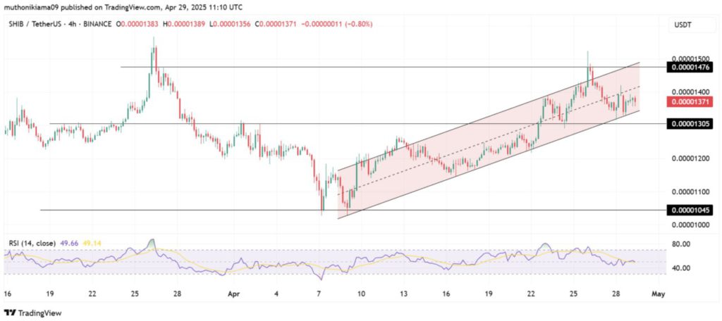 Per 29 April, SHIB diperdagangkan dalam pola ascending parallel channel (saluran paralel naik) pada grafik harga harian—sebuah sinyal umum dari prediksi harga Shiba Inu yang bersifat bullish.