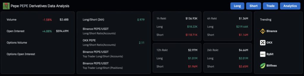 Menurut data dari Coinglass, Open Interest (OI) dalam kontrak berjangka PEPE mendekati angka $600 juta, menandakan lonjakan besar dalam aktivitas perdagangan dengan leverage.