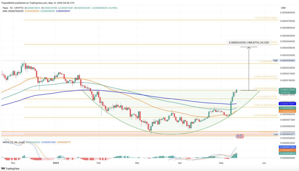 Per 12 Mei, harga PEPE diperdagangkan di atas garis leher. Jika harga penutupan harian berhasil bertahan di atas $0.00001426, ini akan mengonfirmasi breakout signifikan, dengan potensi kenaikan hingga 170%.